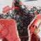 Bandoulière réglable: textile (80% polyester 20% coton) rouge et noir, avec mousquetons métal doré et boucle coulissante métal doré.